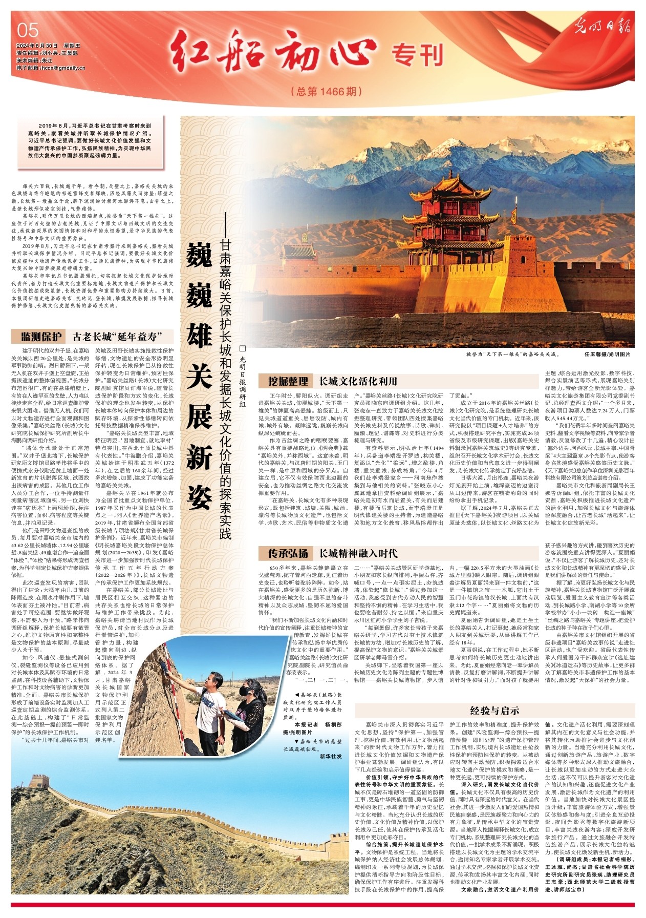 嘉峪關(guān)市牢記總書記殷殷囑托,切實擔起長城文化保護傳承時代責任,著力打造長城文化重要標志地,長城文物遺產(chǎn)保護和長城文化價值挖掘成效顯著,長城資源優(yōu)勢和重要影響力持續(xù)放大。日前,本報調(diào)研組走進嘉峪關(guān)市,撫磚瓦,登長城,觸摸發(fā)展脈搏,探尋長城保護修繕、長城文化發(fā)掘弘揚的嘉峪關(guān)實踐。