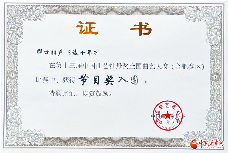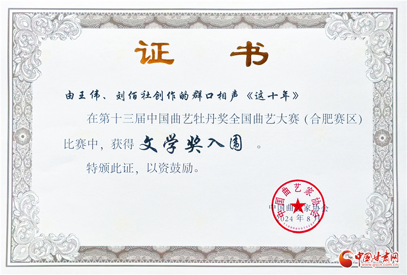據(jù)了解,中國曲藝牡丹獎,是全國性曲藝藝術(shù)專業(yè)最高獎項。第十三屆中國曲藝牡丹獎全國曲藝大賽(合肥賽區(qū)),由中國文學(xué)藝術(shù)界聯(lián)合會、中國曲藝家協(xié)會、安徽省文化和旅游廳、安徽省文學(xué)藝術(shù)界聯(lián)合會、合肥市人民政府主辦,于8月18日至23日舉辦,是本屆牡丹獎四個分賽區(qū)中的最后一站,主要面向相聲、小品、“三書”類節(jié)目。中國曲協(xié)18家團體會員、中國曲協(xié)香港會員分會、中國曲協(xié)有關(guān)專業(yè)委員會、中直文藝院團以及省級文藝院團報送的節(jié)目參賽。期間,共收到480多個節(jié)目,48個節(jié)目入圍,《這十年》為甘肅地區(qū)唯一一件入圍作品。