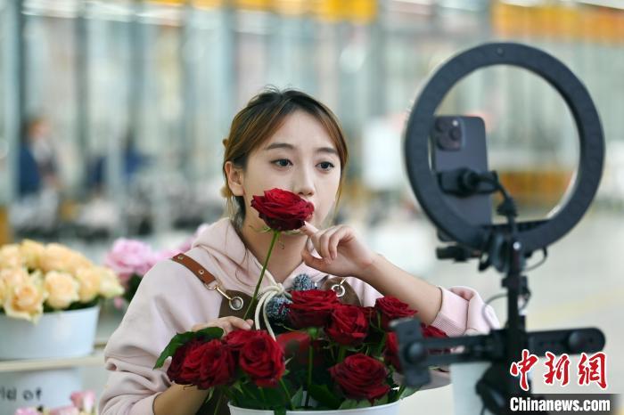11月20日,在甘肅省臨夏回族自治州臨夏市百益億農(nóng)國(guó)際鮮花港內(nèi),工作人員進(jìn)行網(wǎng)絡(luò)直播售賣鮮切玫瑰。九美旦增 攝