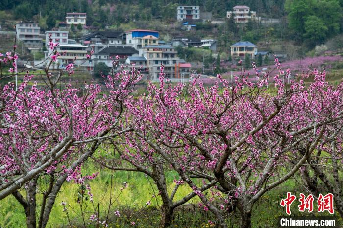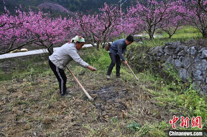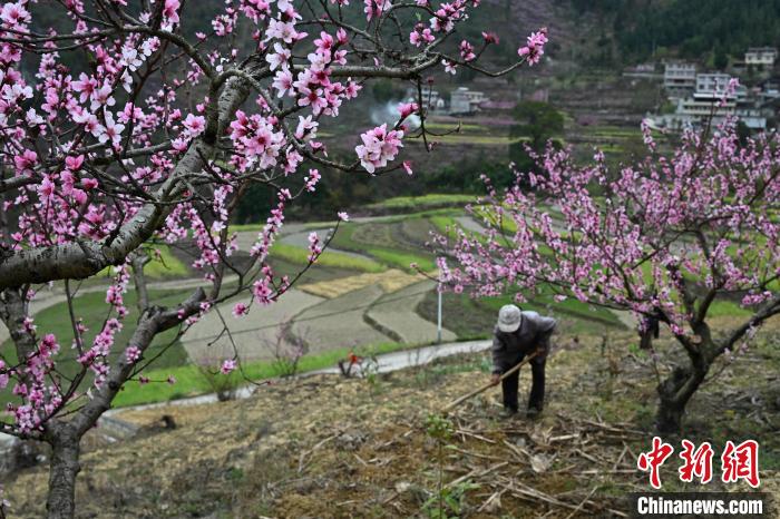 3月15日,在廣西田林縣浪平鎮(zhèn)浪平村,村民在桃樹下勞作。黃數(shù)情 攝