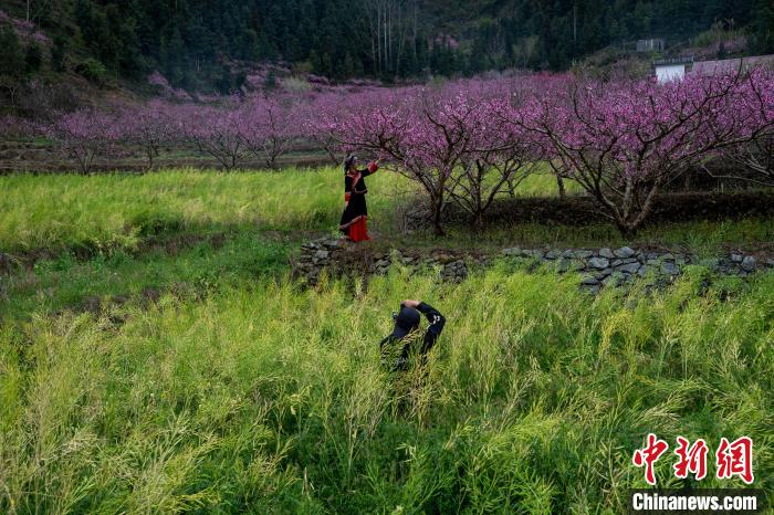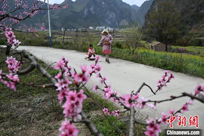 時(shí)下正是桃花盛開的時(shí)節(jié),在廣西田林縣浪平鎮(zhèn)浪平村,村民種植的桃花競(jìng)相綻放。滿樹繁花與錯(cuò)落村舍相互映襯,還有樹旁玩耍的孩童、樹下勞作的村民,動(dòng)靜交織,構(gòu)成一幅絕美的田園春景圖。圖為3月15日,在廣西田林縣浪平鎮(zhèn)浪平村,村民在桃樹下勞作。黃數(shù)情 攝