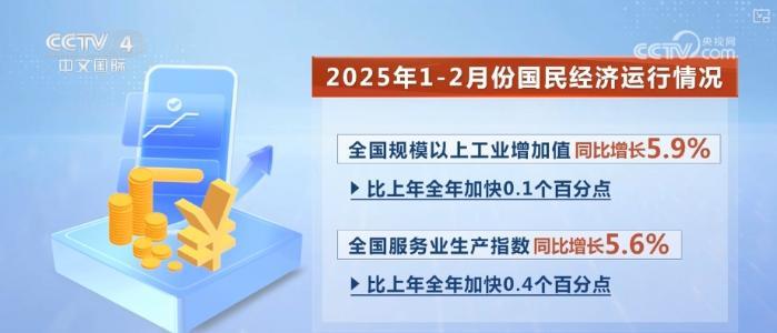 數(shù)據(jù)顯示,2025年1—2月份,工業(yè)生產(chǎn)較快增長(zhǎng),全國(guó)規(guī)模以上工業(yè)增加值同比增長(zhǎng)5.9%,比上年全年加快0.1個(gè)百分點(diǎn)。服務(wù)業(yè)增勢(shì)較好,全國(guó)服務(wù)業(yè)生產(chǎn)指數(shù)同比增長(zhǎng)5.6%,比上年全年加快0.4個(gè)百分點(diǎn)。市場(chǎng)銷(xiāo)售增長(zhǎng)加快,社會(huì)消費(fèi)品零售總額83731億元,同比增長(zhǎng)4.0%,比上年全年加快0.5個(gè)百分點(diǎn)。