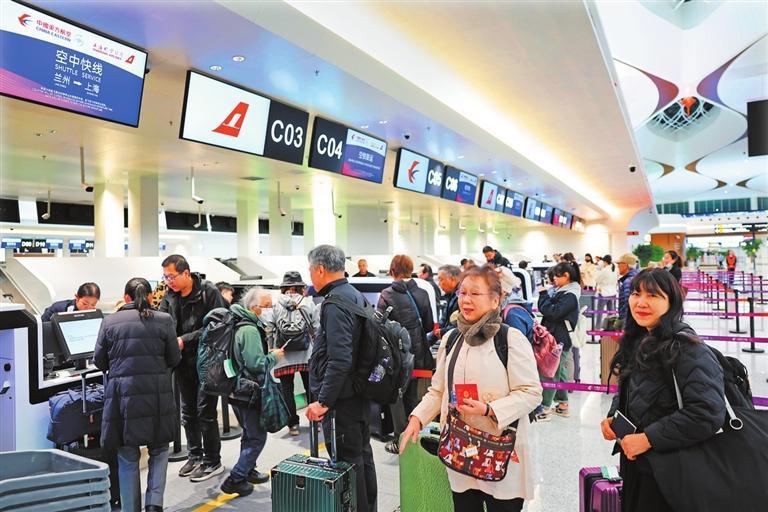旅客在T3航站樓出港大廳柜臺窗口辦理值機。新甘肅·甘肅日報記者 田蹊