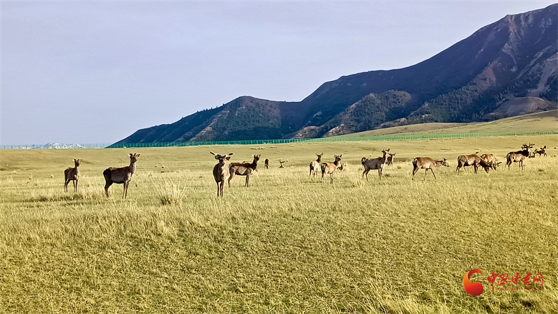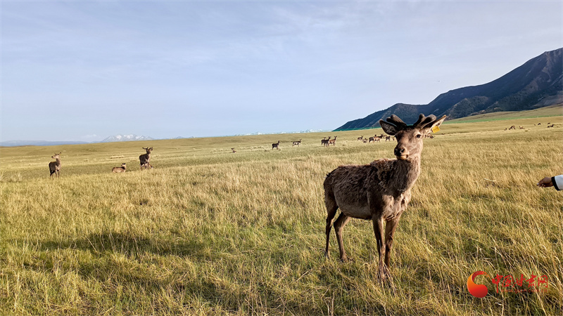 初夏的肅南大河草原牧草逐漸返青,一群群馬鹿在草原上悠閑覓食,游客到來(lái)并沒有打擾它們的正?;顒?dòng)。