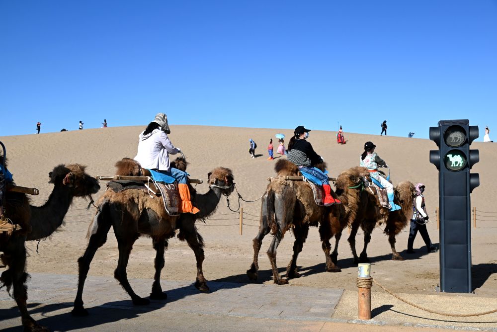 5月24日,敦煌市鳴沙山月牙泉景區(qū)的交通信號燈“綠駱駝燈”亮起時,農(nóng)戶牽著駱駝有序通過。敦煌市鳴沙山月牙泉景區(qū)設置具有駱駝元素的交通信號燈,保障了景區(qū)交通安全順暢。新華社發(fā)(張曉亮攝)