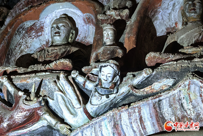 這里最具特色的是東窟一層龕楣兩側(cè)懸塑的飛天,相對(duì)作凌空飛舞之勢(shì)。金塔寺內(nèi)的高肉雕彩塑飛天歷史遠(yuǎn)早于敦煌飛天,屬洞窟藝術(shù)之罕見(jiàn)珍品,為全國(guó)僅有。