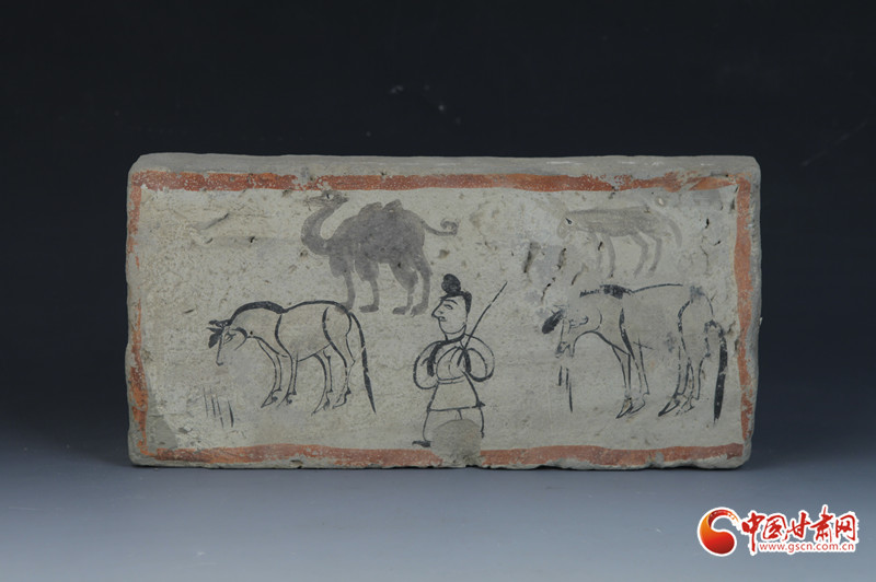 另一方面,它采用沒(méi)骨畫法,以彩色為墨,通過(guò)墨色濃淡來(lái)表現(xiàn)空間的遠(yuǎn)近。遠(yuǎn)處駱駝、毛驢的形象在墨色變化中層次分明,形成強(qiáng)烈的對(duì)比感。“此磚不僅是中國(guó)已知現(xiàn)存較早運(yùn)用沒(méi)骨畫法的美術(shù)作品之一,而且這兩種繪畫手法并用在一塊壁畫磚上的情況,在中國(guó)美術(shù)史上也是較早的發(fā)現(xiàn),甚至比西方出現(xiàn)類似手法還要早。”孫麗娟介紹。