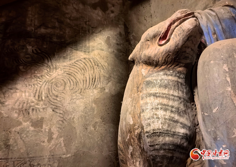 為何要將老虎塑造得如此乖巧?答案就在老虎旁邊的壁畫中。壁畫里的老虎張牙舞爪、張著大嘴,盡顯兇猛之態(tài)。而羅漢手中的老虎卻溫順如貓,這一鮮明對比,恰恰生動(dòng)地說明了羅漢已將老虎降服。