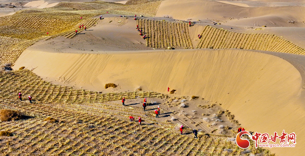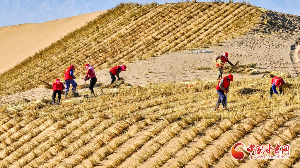 連日來(lái),在張掖市肅南裕固族自治縣明花鄉(xiāng)西南部的干旱荒漠區(qū),運(yùn)草車輛往復(fù)穿梭,1600余名治沙工人于巴丹吉林沙漠西南緣的沙丘間忙碌作業(yè)。他們劃線、背草、俯身鋪草、揮鍬壓埋,全力營(yíng)建沙障與固沙林帶,為沙漠牢牢“鎖邊”。