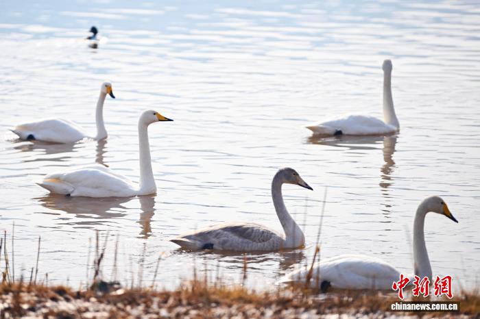 12月9日,在位于甘肅省蘭州市西固區(qū)達川鎮(zhèn)三河口濕地,從西伯利亞而來的白天鵝嬉戲。據(jù)悉,該地屬于黃河、湟水、大通河三河交匯之處,生態(tài)環(huán)境良好,擁有1200畝蘆葦蕩。近年來,該地吸引越來越多來自西伯利亞的白天鵝選擇在此停歇棲息。中新社記者 李亞龍 攝