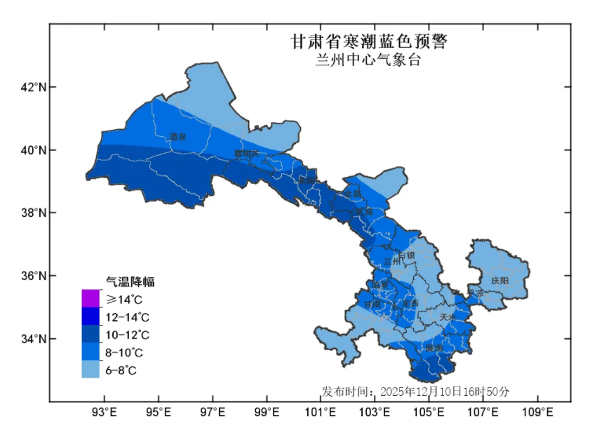 蘭州中心氣象臺(tái)2025年12月10日16時(shí)50分發(fā)布寒潮藍(lán)色預(yù)警:預(yù)計(jì)11日至13日清晨,全省大部自西向東最低氣溫下降6-8℃,其中河西五市、隴南等部分地方及隴中局部地方下降8~10℃,局地可達(dá)10℃以上,上述部分地方將出現(xiàn)寒潮。河西五市降溫時(shí)段為11日白天至12日白天,省內(nèi)其余地方降溫時(shí)段為11日夜間至13日清晨。請注意防范!