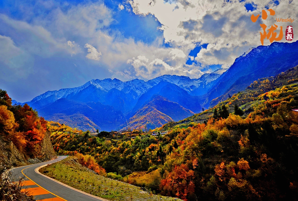 山巔的白雪與彩林形成鮮明對(duì)比,紅與黃,白與藍(lán),在陽光的映照下,共同編織出一幅溫柔而夢(mèng)幻的畫卷。